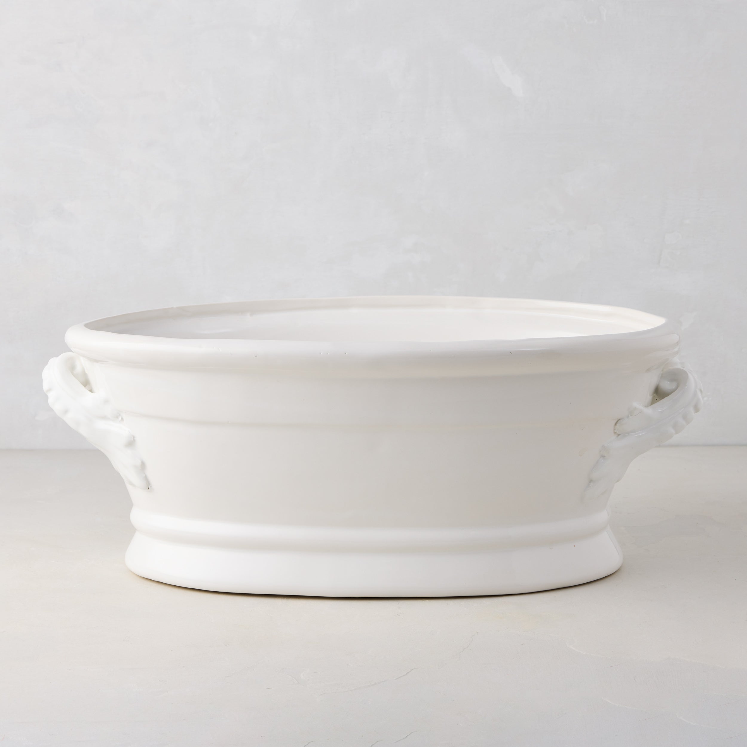 Bring a touch of Italian craftsmanship to your home with the Ceramic Baccello Ice Bucket, the ideal statement piece for any gathering. Crafted in Italy, this oversized bucket features a sleek white glaze and a unique ceramic handle with intricate artisanal details. It is designed to hold and chill up to four bottles of wine plus ice and is a beautiful display piece when not in use.
